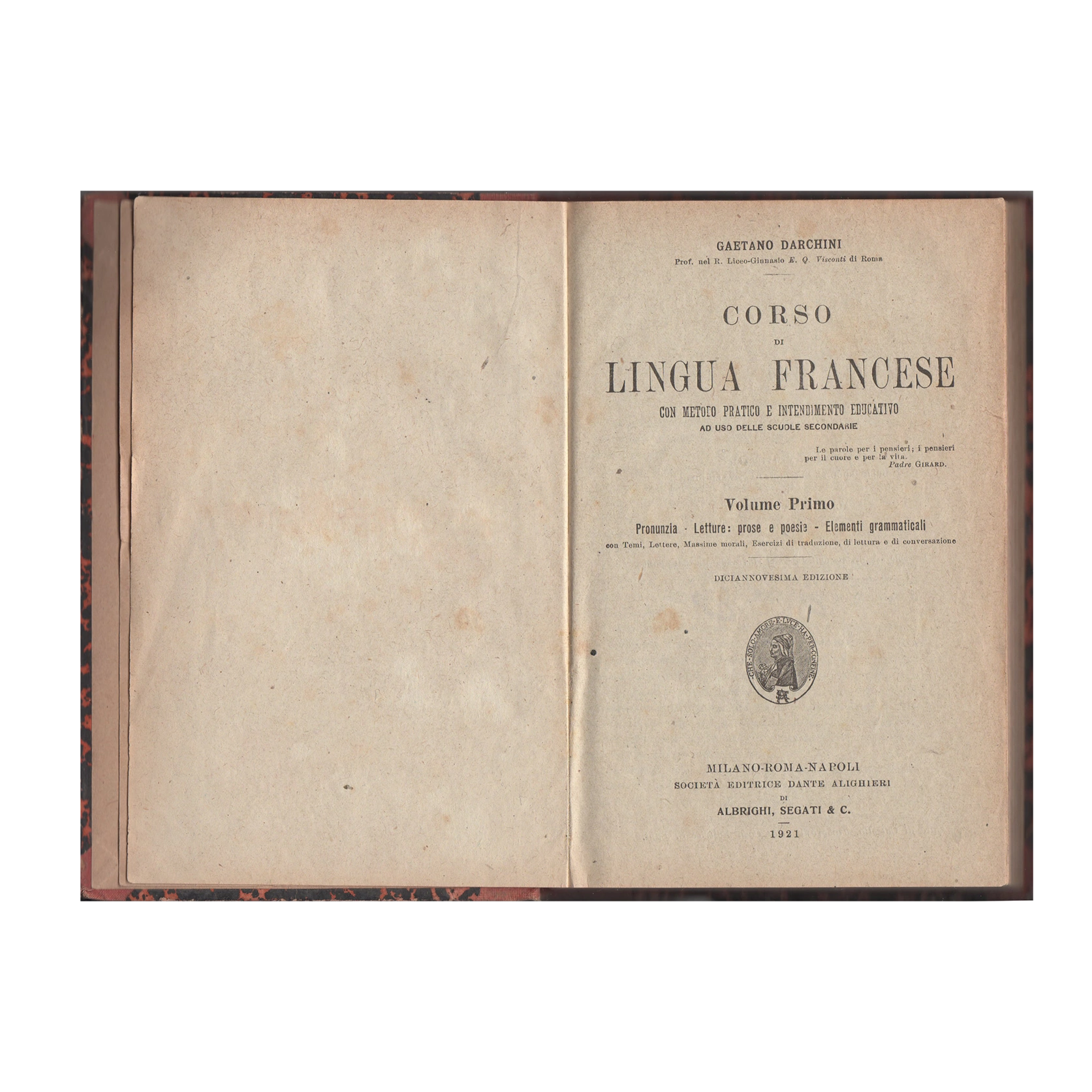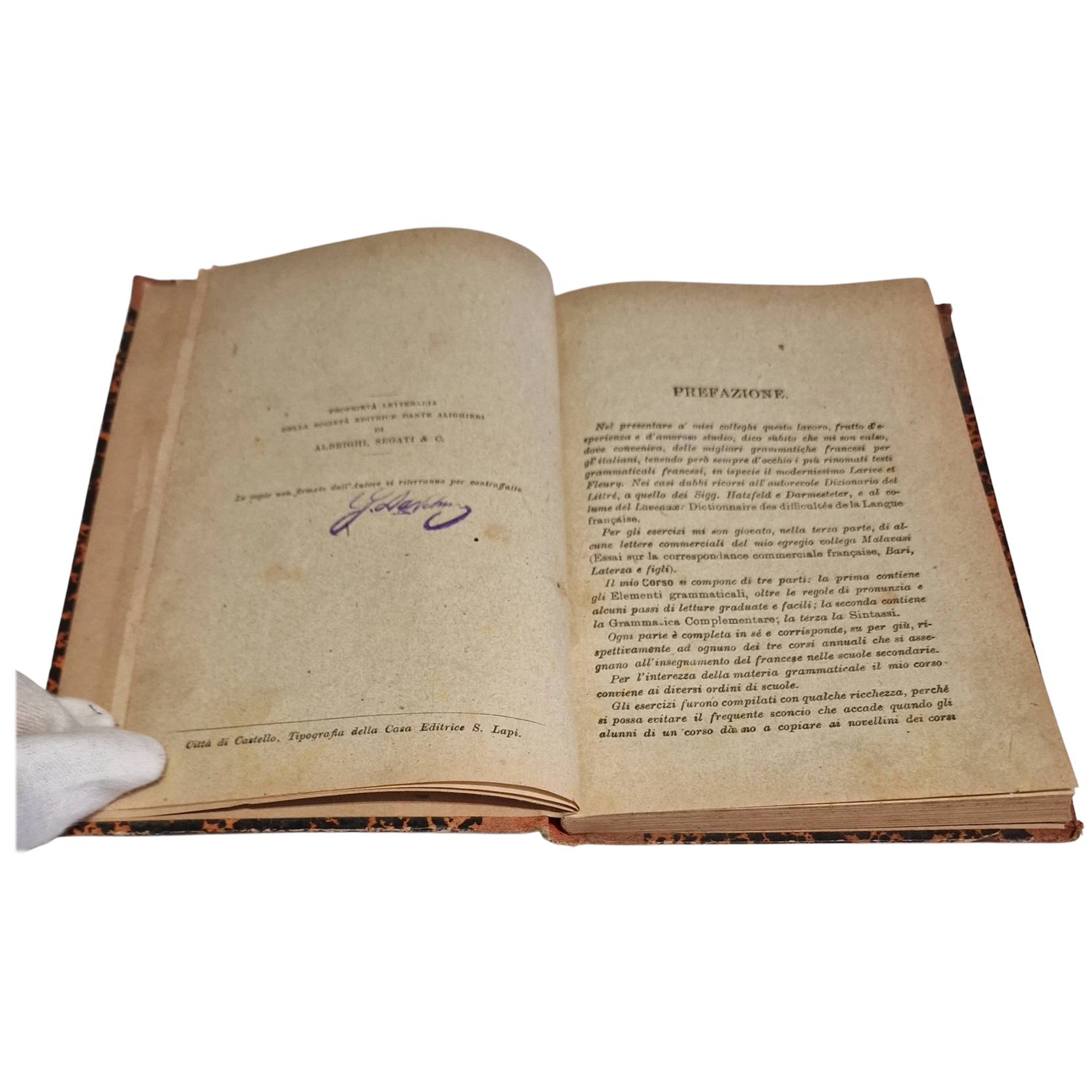 Authentic early 20th century educational book titled Corso di Lingua Francese, written by Gaetano Darchini, professor at the historic E.Q. Visconti Classical High School in Rome. This volume was created for Italian secondary schools and reflects the teaching methods of the period, including pronunciation guides, reading passages, grammatical foundations and practical translation and conversation exercises.