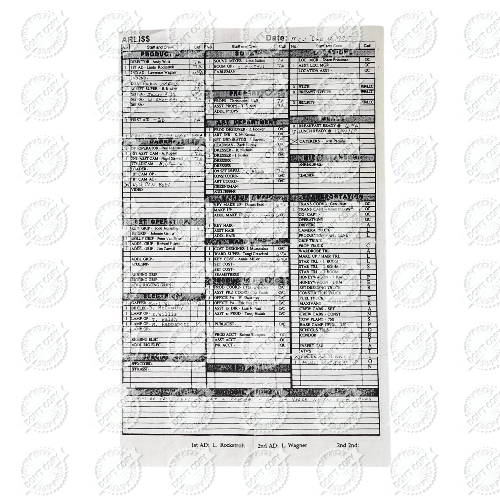 Original double-sided production call sheet from the television series Arli$$, dated December 4, 1995. This authentic document details the filming schedule for the day, including scenes, cast call times, and full production crew requirements.