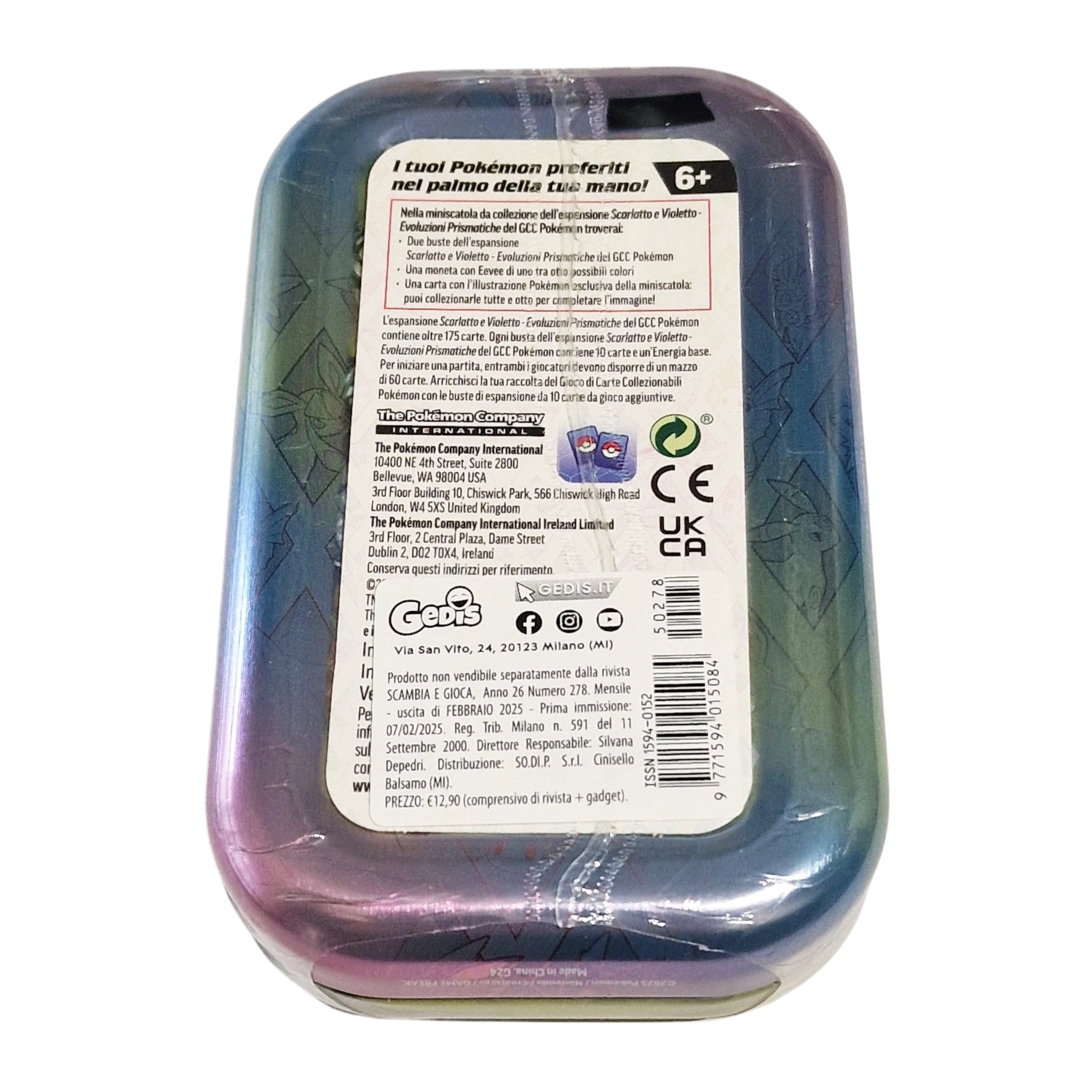 Contiene due buste dell’espansione Scarlatto e Violetto – Evoluzioni Prismatiche del GCC Pokémon. Ogni busta di espansione contiene 10 carte e un’Energia base. Le carte variano a seconda delle buste.