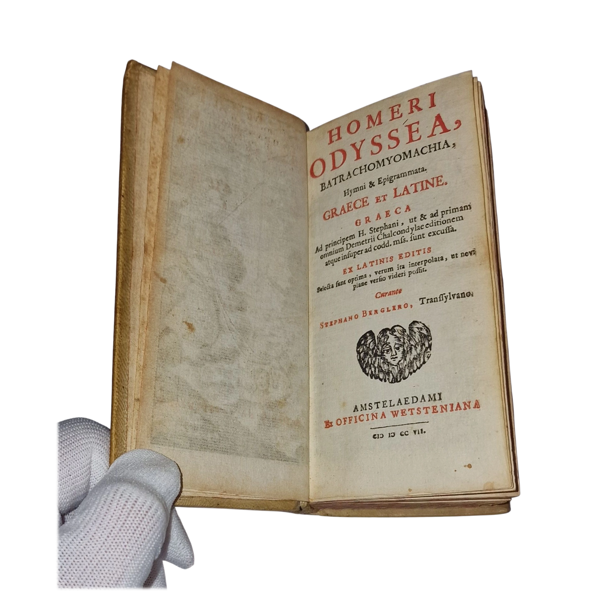 Early 18th-century edition of Homer’s Odyssey, including the Batrachomyomachia, Hymns and Epigrams, printed in Amsterdam by Henricus Wetstein in 1707, with Greek text and facing Latin translation edited by Stephanus Bergler.