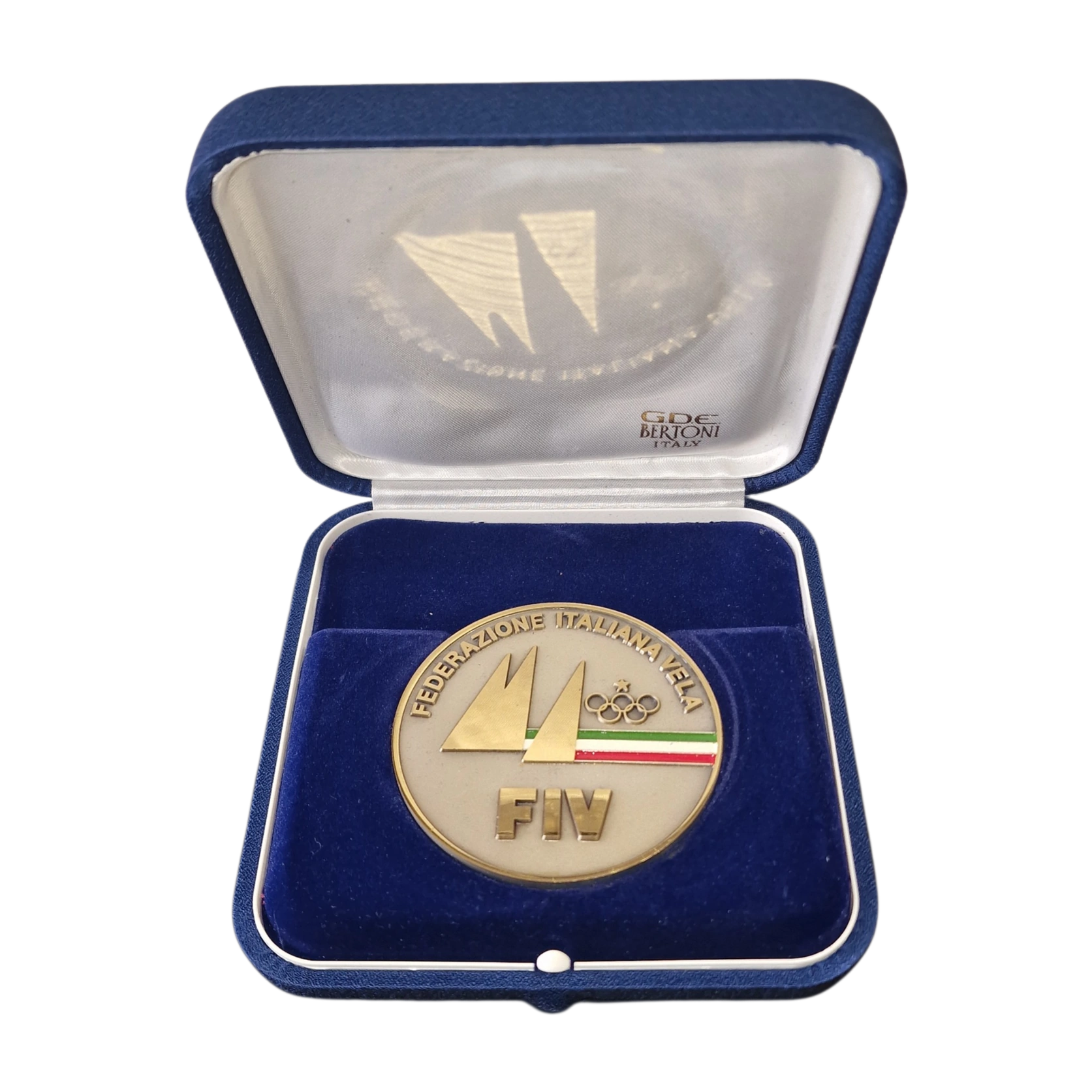 Official commemorative medal issued by the Italian Sailing Federation, presented as an institutional representation piece and preserved in its original presentation case. The front features the FIV emblem with stylised sails, Olympic rings and the Italian tricolour stripe, clearly identifying its connection to Italian sailing and Olympic sport.