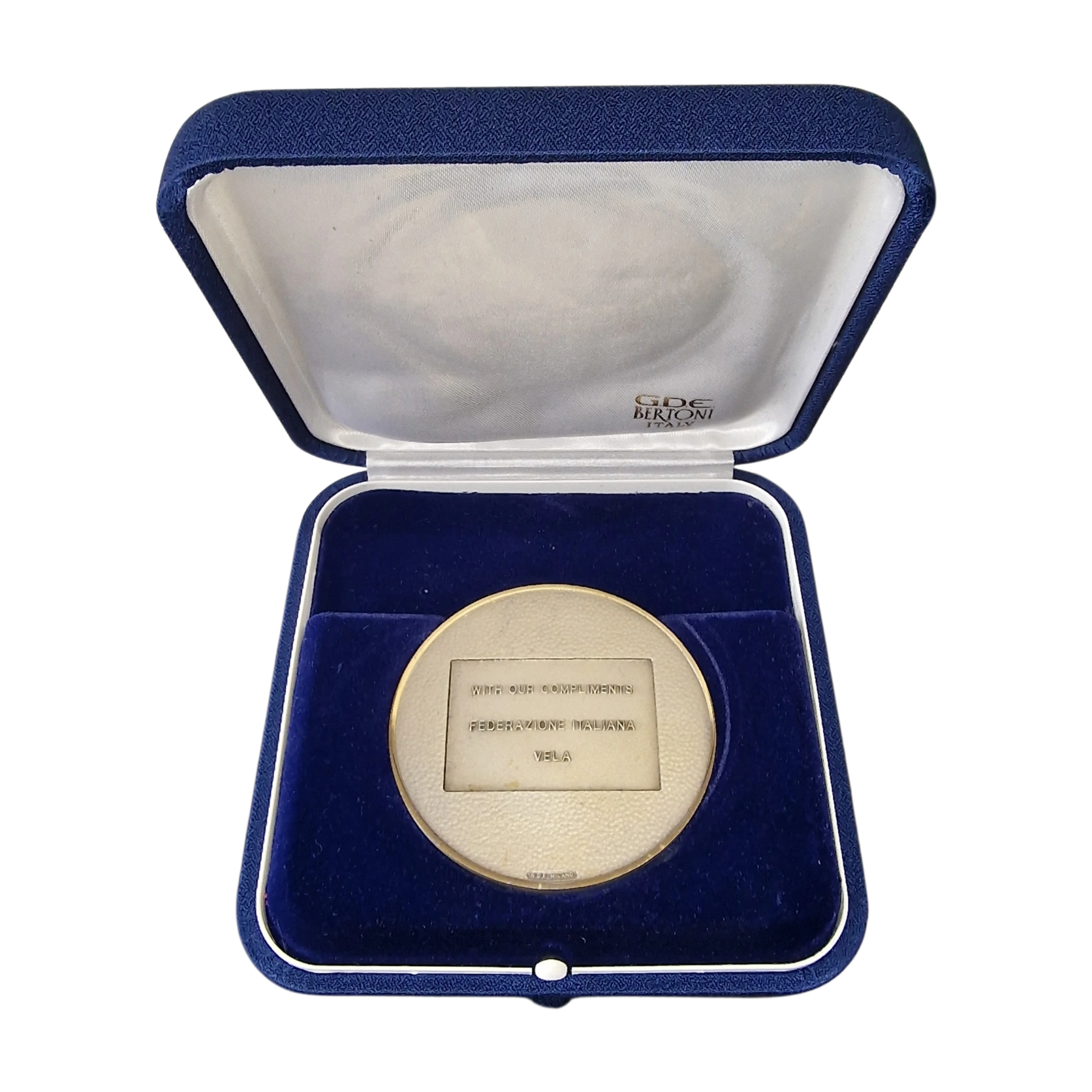 The reverse bears the engraved inscription: “With our compliments Federazione Italiana Vela”