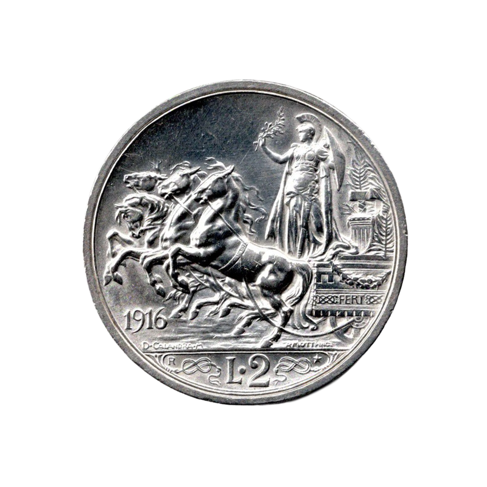 Original Kingdom of Italy silver coin, denomination 2 Lire, dated 1916, issued during the reign of Victor Emmanuel III. This issue is known as the Quadriga Italica, one of the most iconic designs of early 20th-century Italian coinage.
