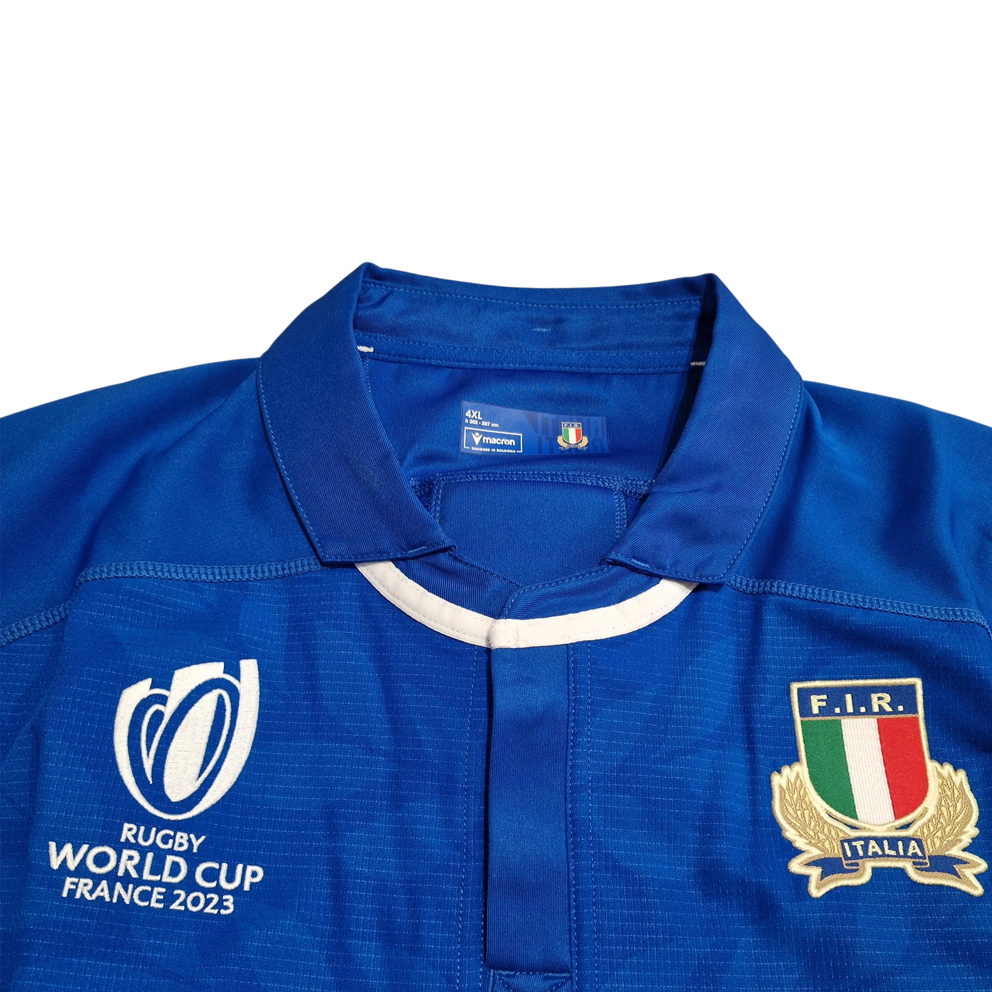This is a special limited-edition Italy National Rugby Team jersey from the Rugby World Cup France 2023, manufactured by Macron.