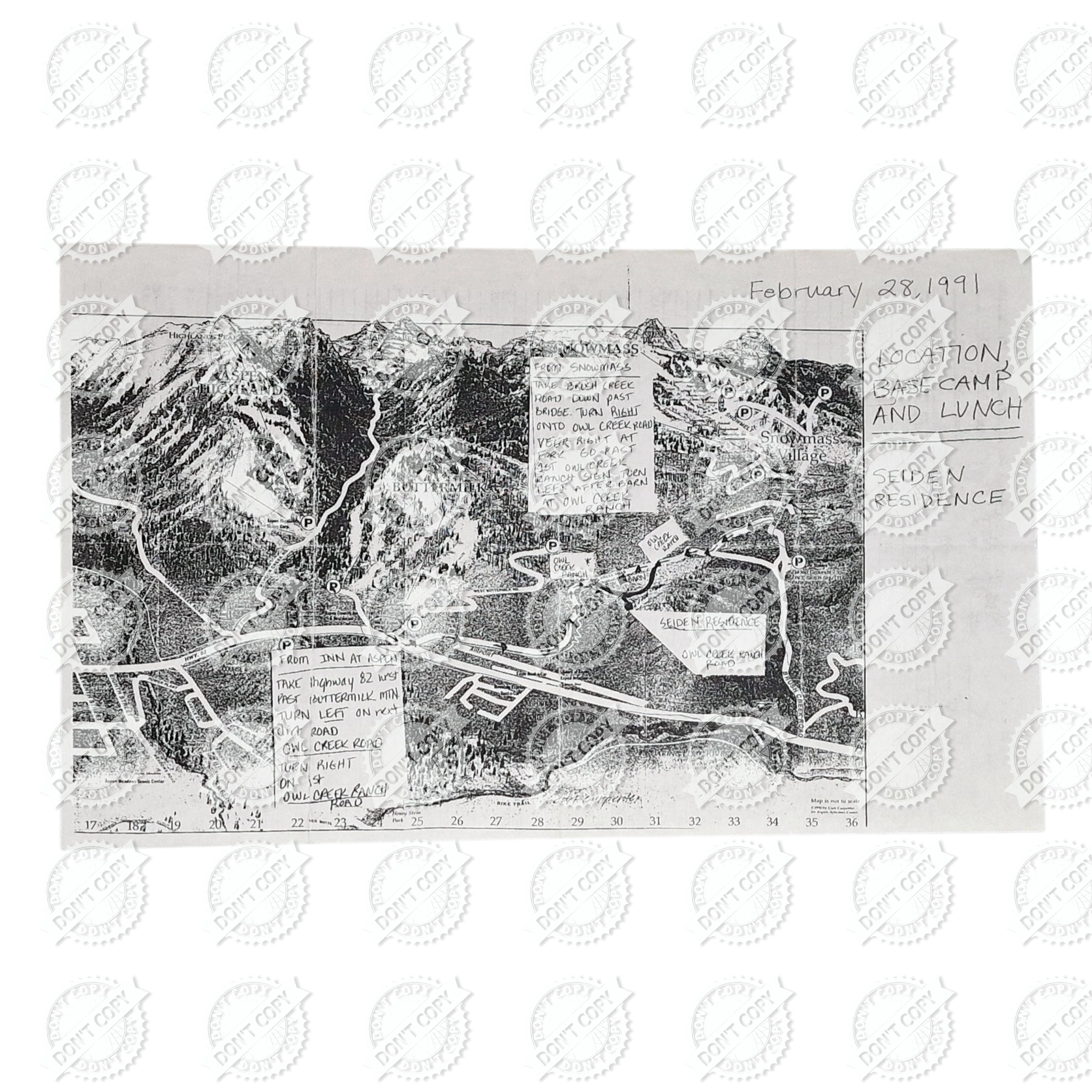 Original production call sheet from the TV production Murder in High Places, dated February 28, 1991. Double-sided sheet with daily scene schedule, crew listings, and a detailed map of the filming locations.