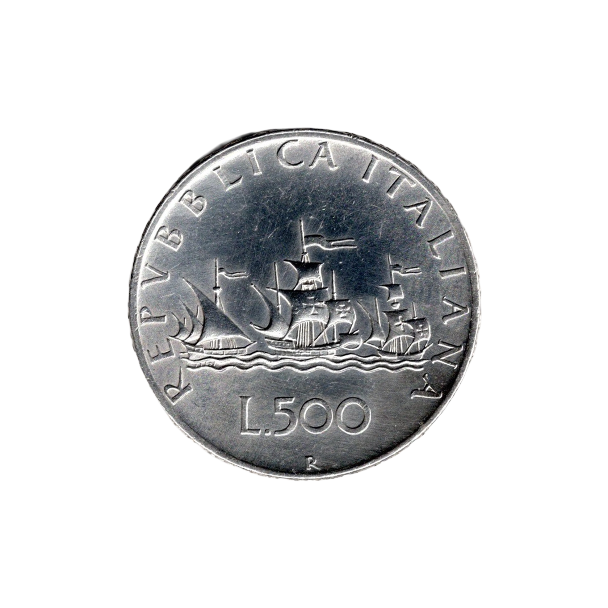Reverse: Three sailing ships (Caravels) with REPVBBLICA ITALIANA and denomination L.500