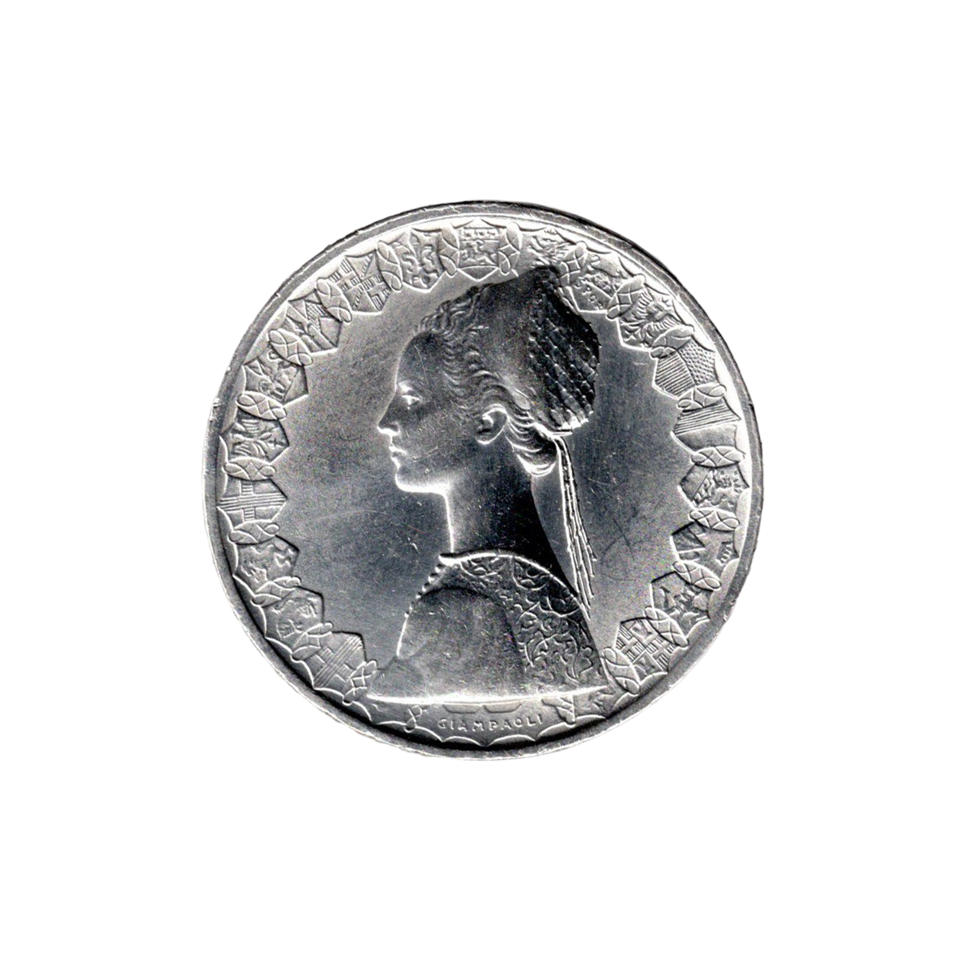 Obverse: Allegorical female bust symbolizing the Italian Republic, signed Giampaoli