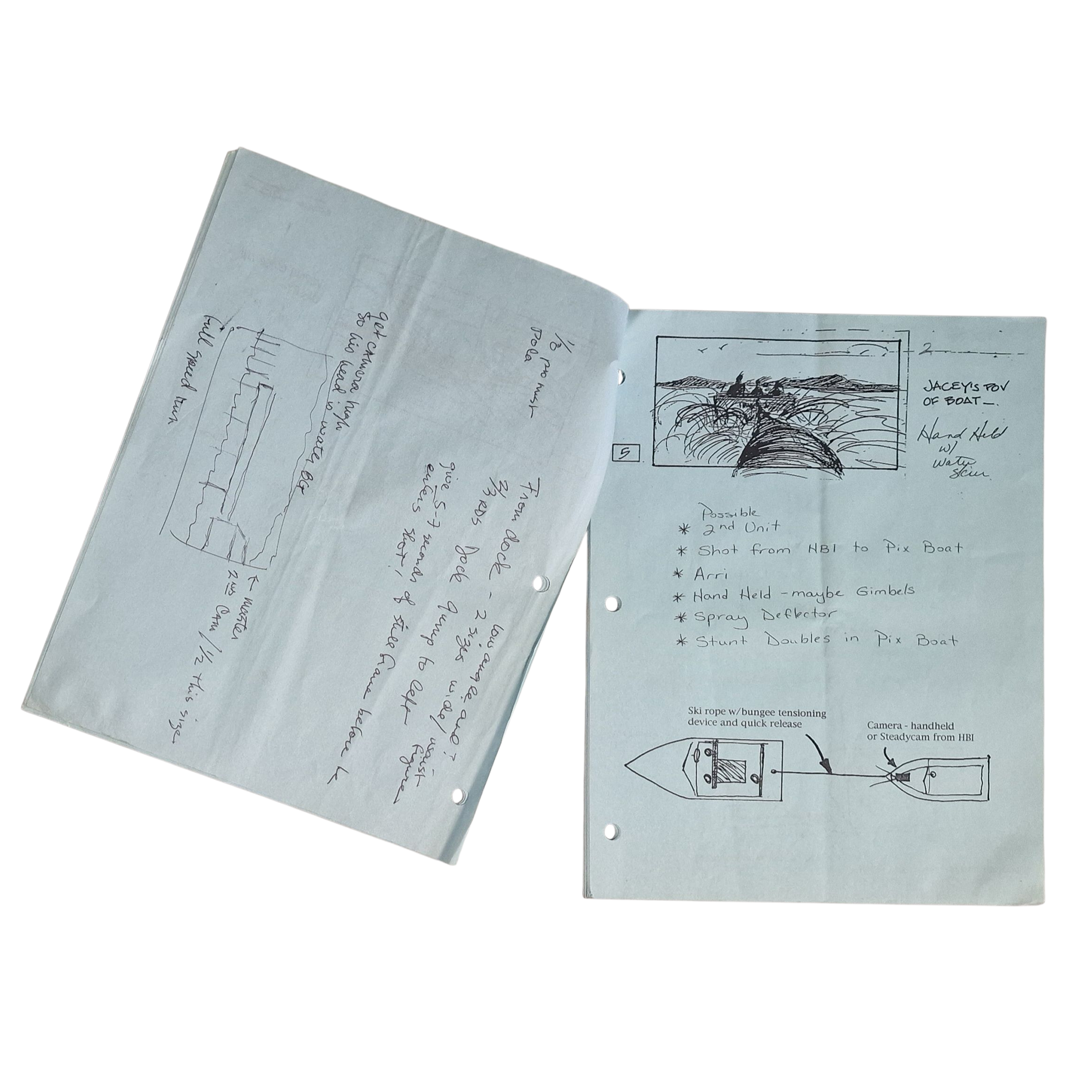 Attached original storyboards and technical sketches on blue pages, featuring hand-drawn sequences (boat scenes, camera movements, stunt notes)