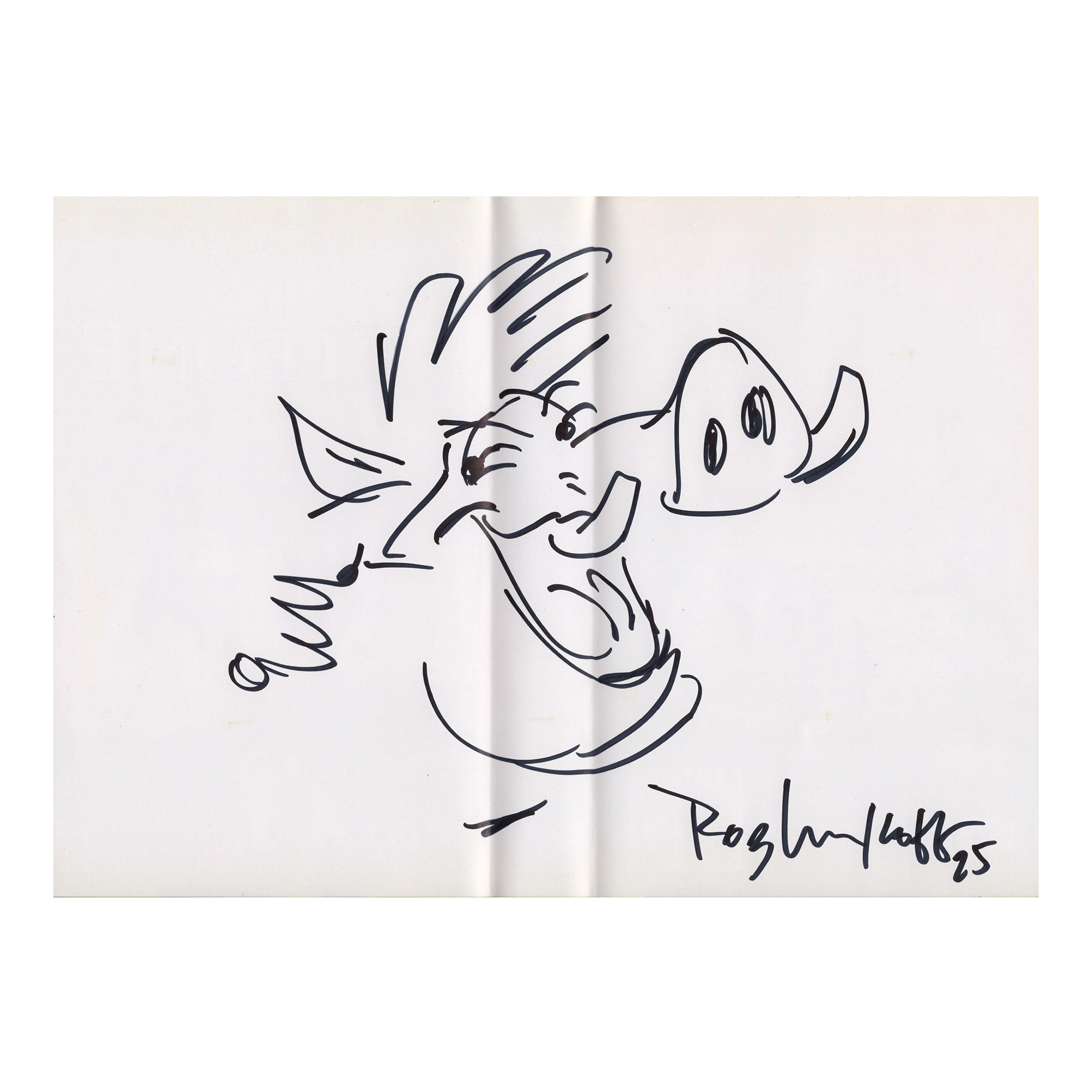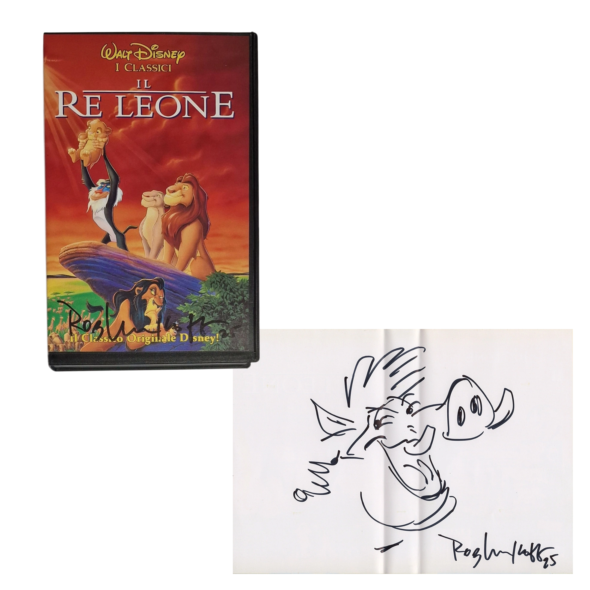A true gem for Disney fans and collectors: this is an original VHS release of The Lion King (1994), personally signed by co-director Rob Minkoff on the front cover. Adding even more value and uniqueness, the back of the case features an original hand-drawn sketch of Pumbaa, lovingly illustrated by Minkoff himself. He also signed the case a second time, next to the artwork, making this a one-of-a-kind collector’s item.