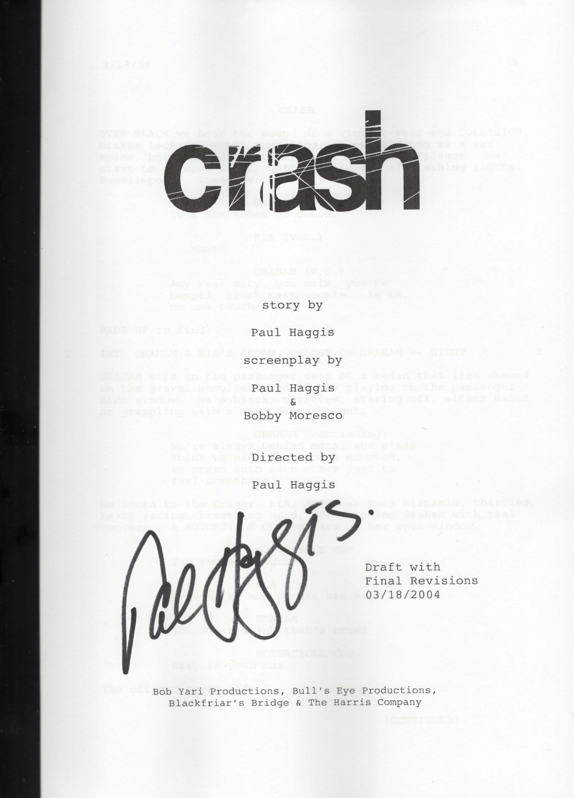 We are thrilled to present a truly unique piece of Hollywood history: the complete final revision script of “Crash” (2004), personally signed by Academy Award–winning writer-director Paul Haggis to help our non-profit organization.
