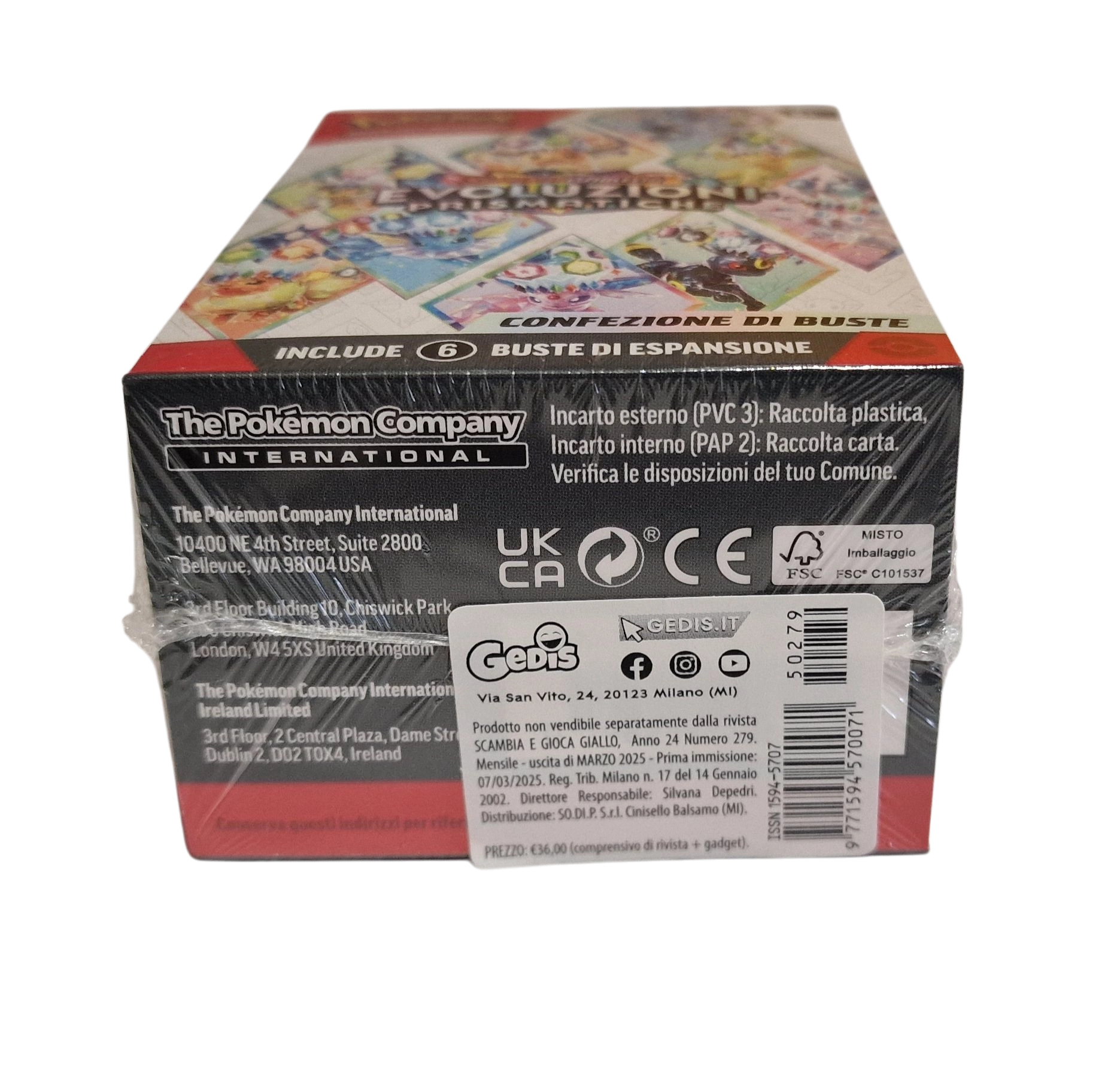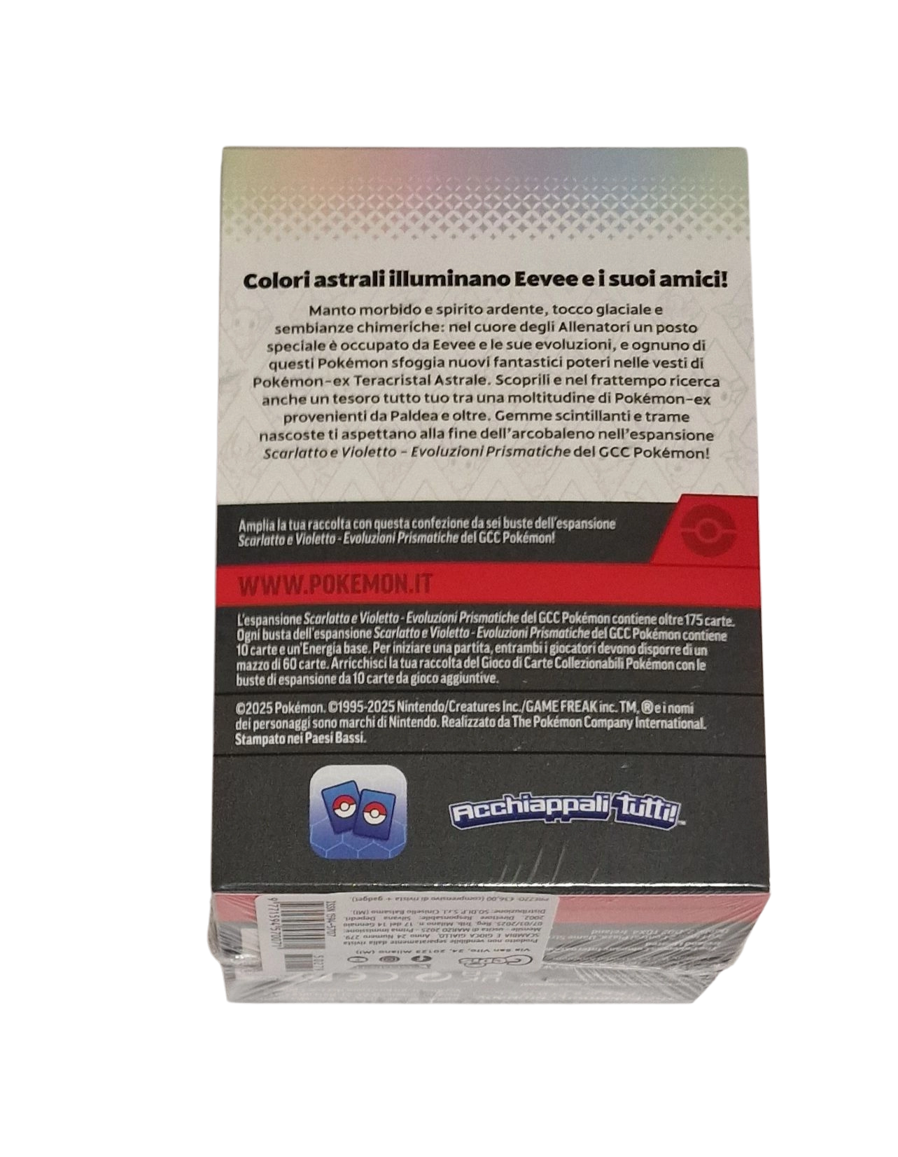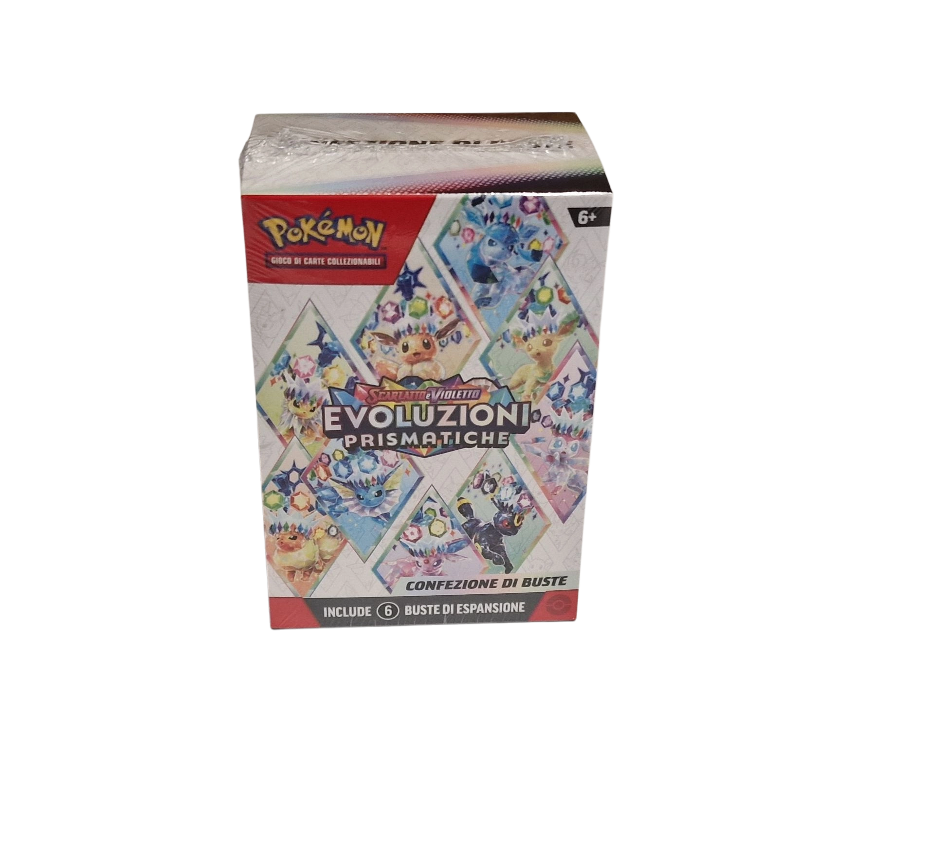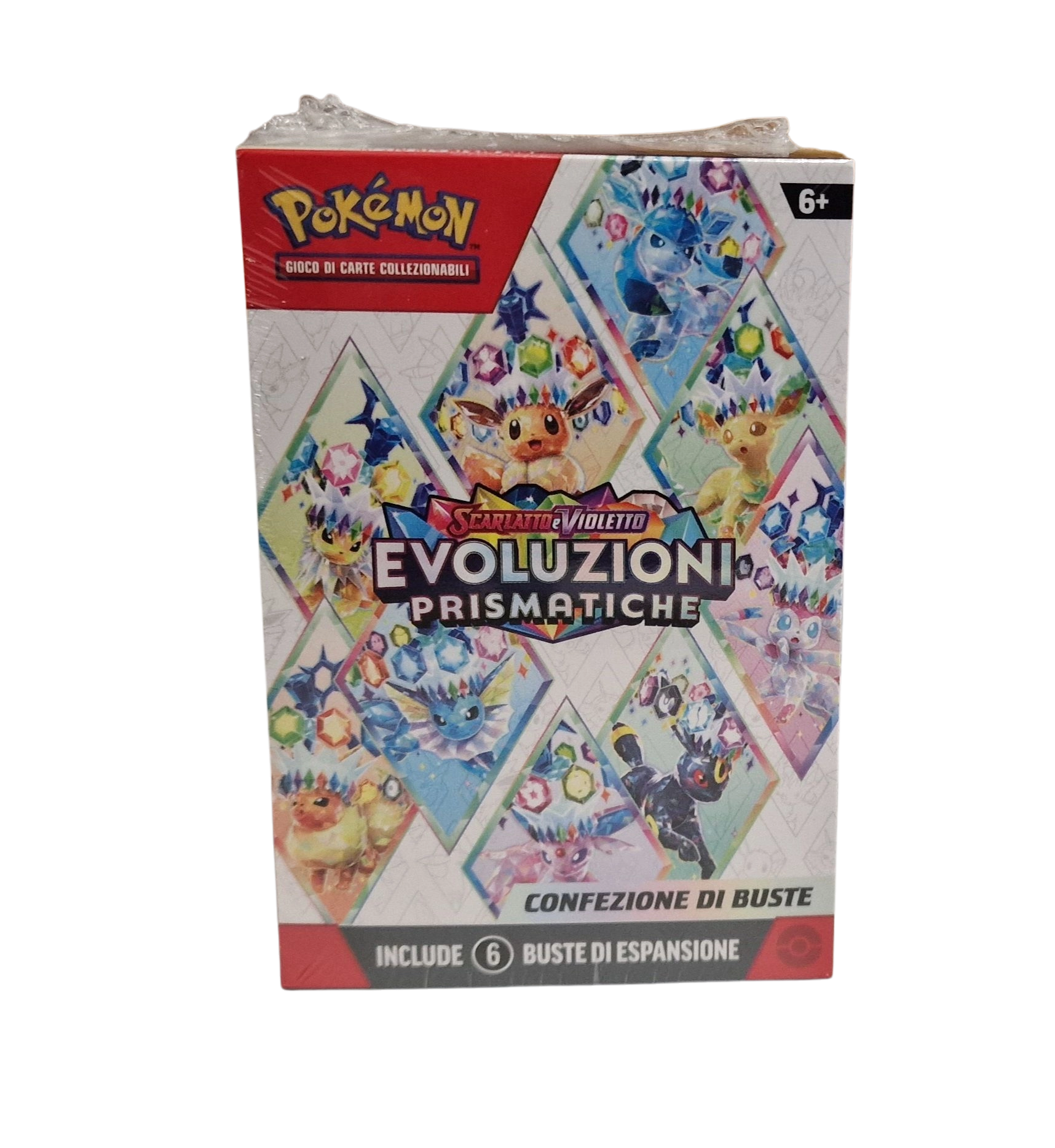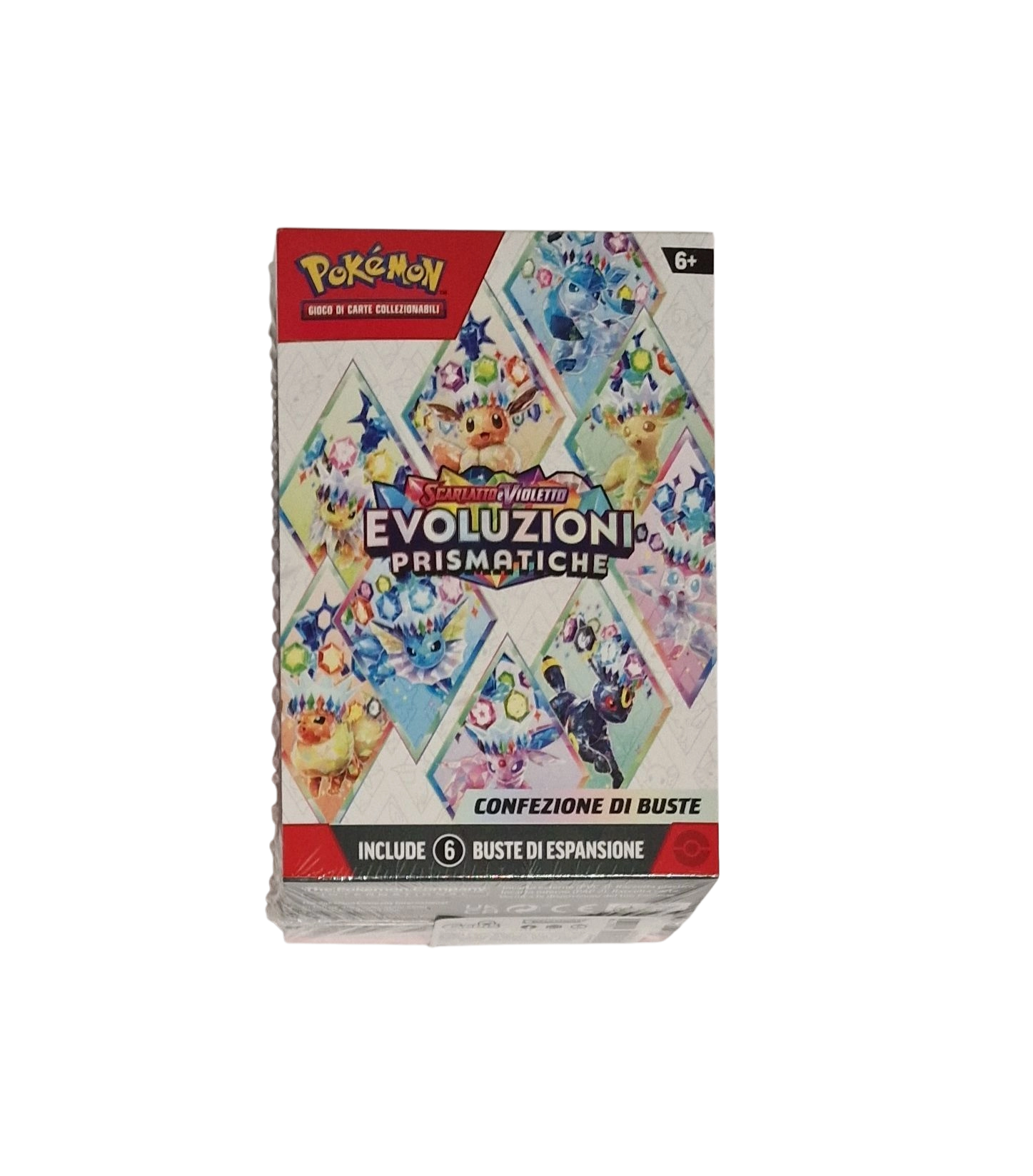Questa confezione include sei buste dell’espansione Scarlatto e Violetto – Evoluzioni Prismatiche del GCC Pokémon, ognuna contenente 10 carte, una carta Energia base e una carta codice per il GCC Pokémon Live.
