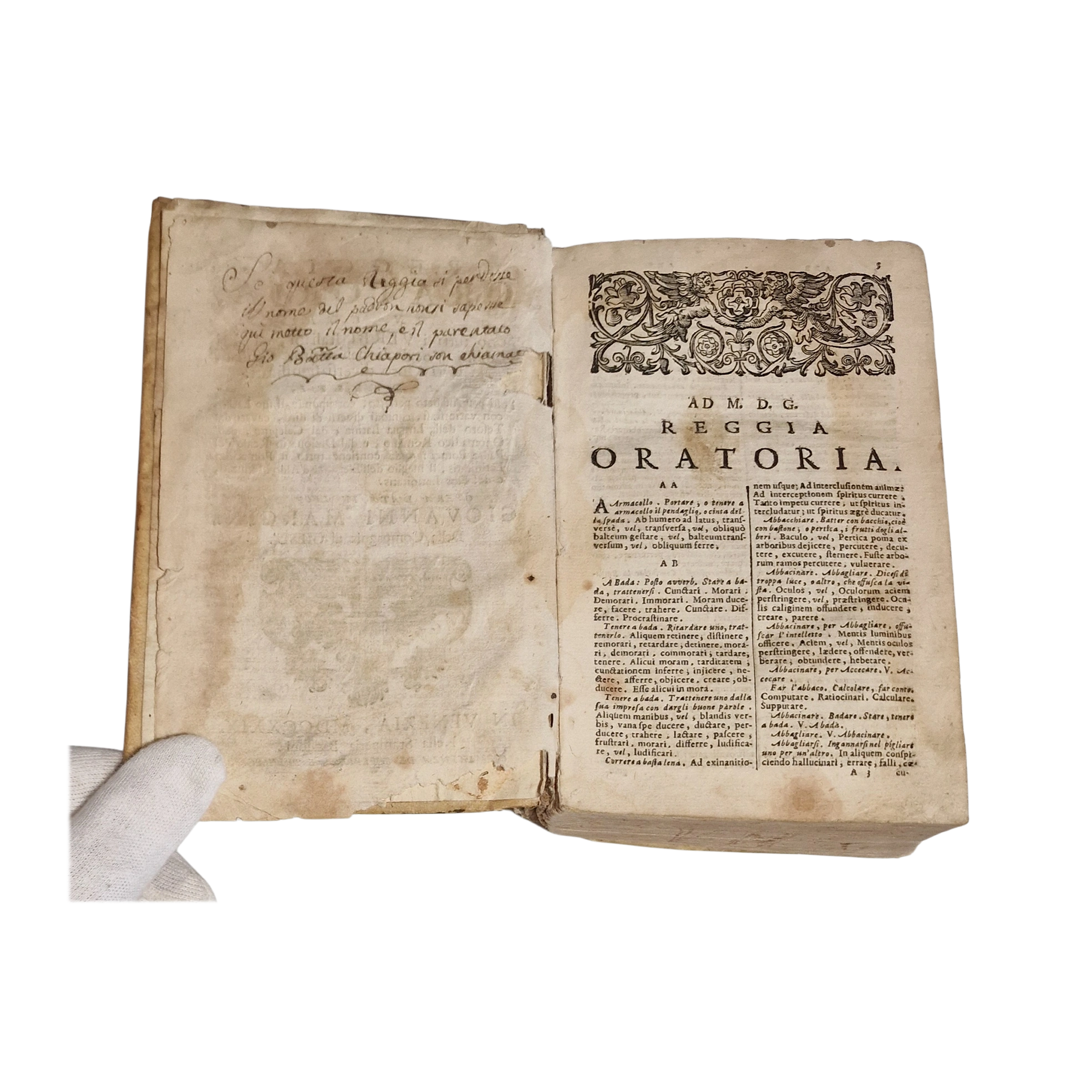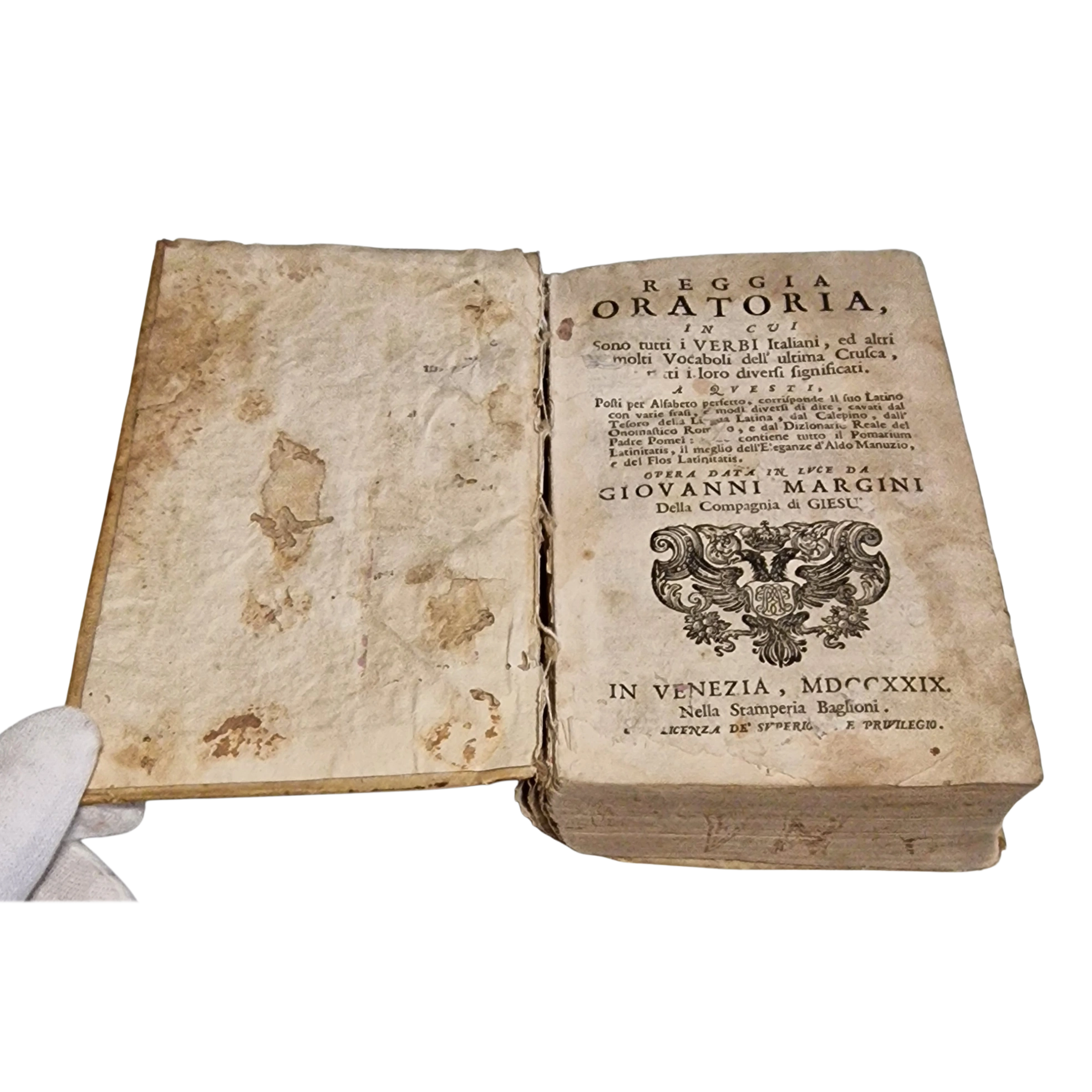 Authentic 18th century antique book: “Reggia Oratoria”, a Latin rhetoric and language manual written by Jesuit author Giovanni Margini (Society of Jesus) and printed in Venice in 1729 by Stamperia Baglioni. A fascinating historical piece connected to Jesuit education and classical studies, focused on rhetoric and the correct usage of Latin vocabulary, typical of scholarly and academic learning of the period.