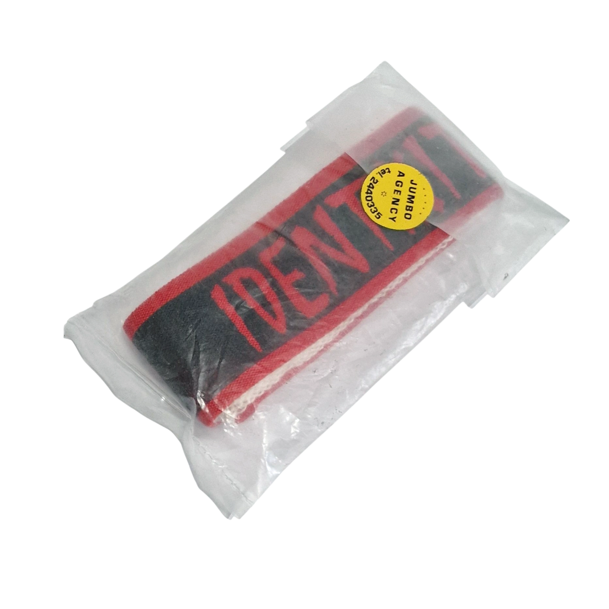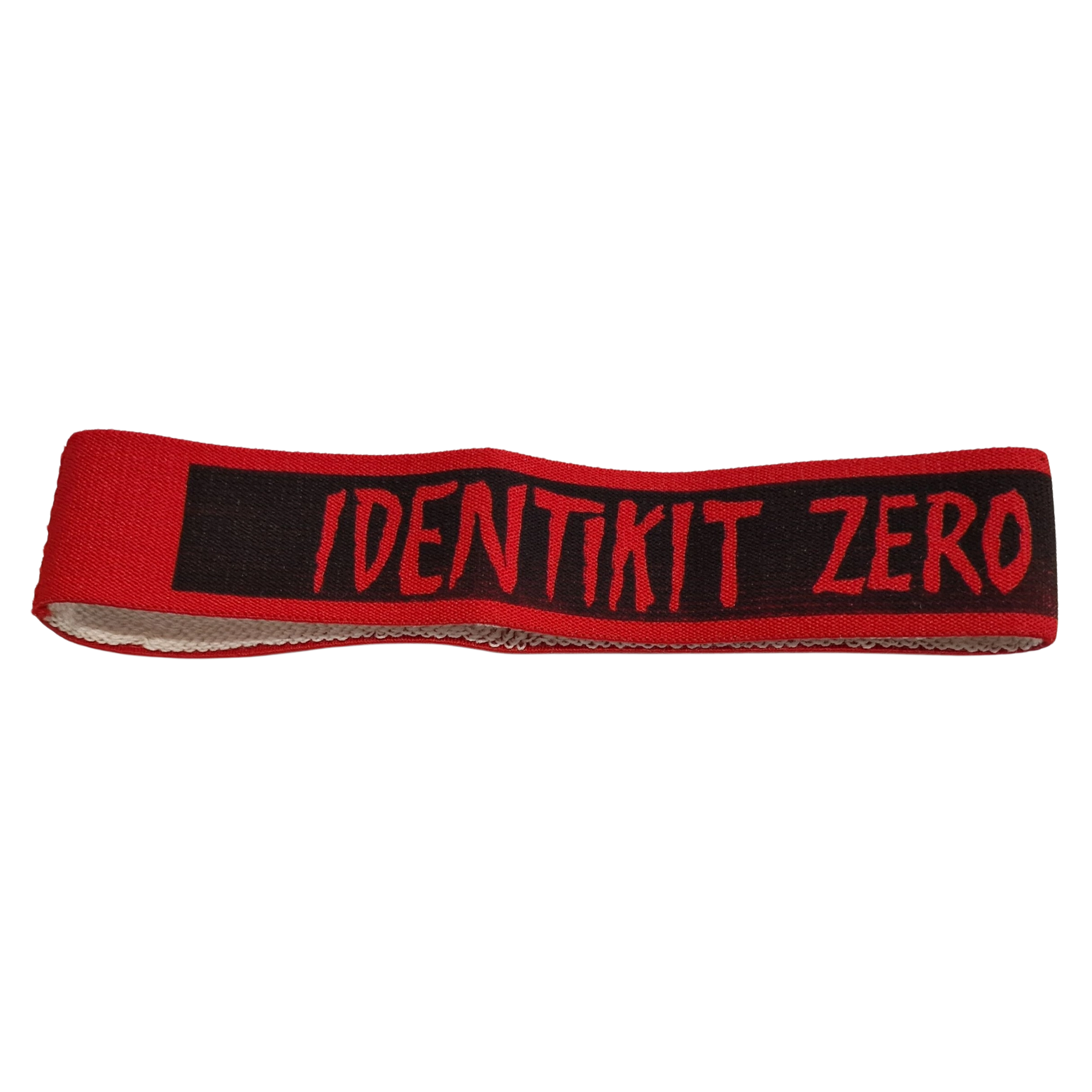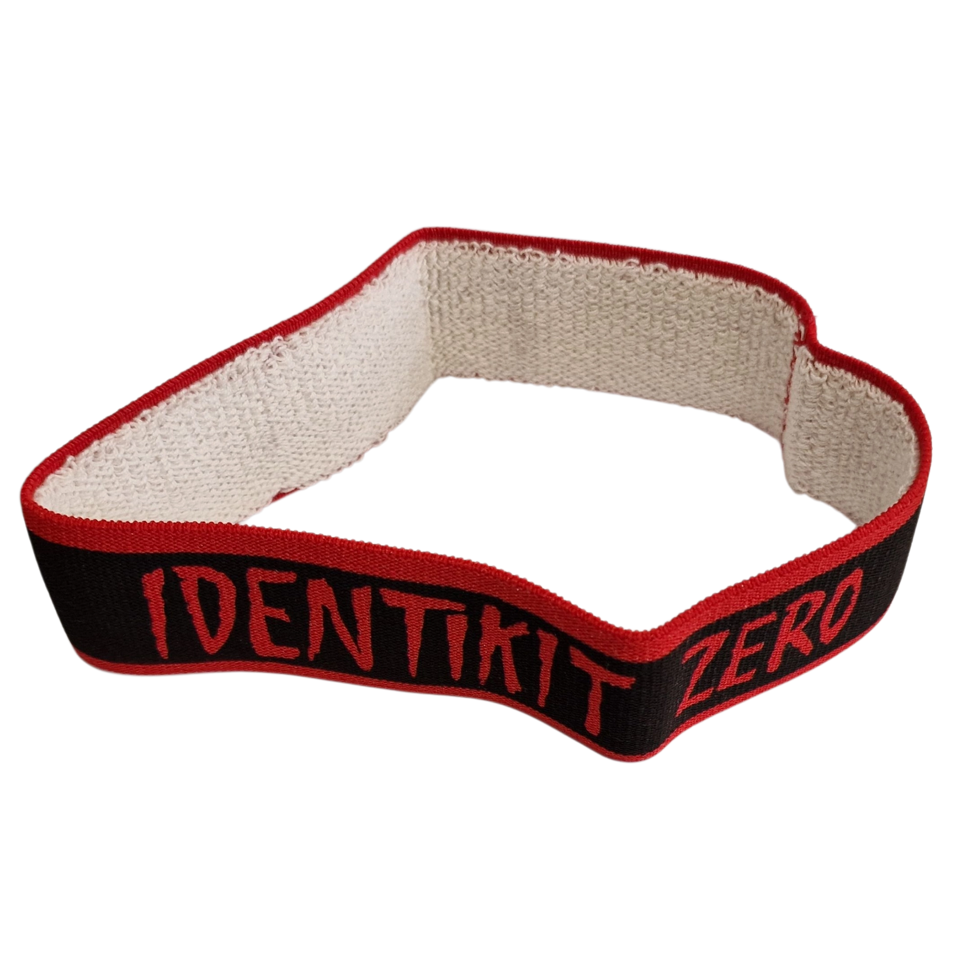 🖤 The headband is made of stretch cotton fabric in red and black, with the bold writing IDENTIKIT ZERO stitched in theatrical red lettering.