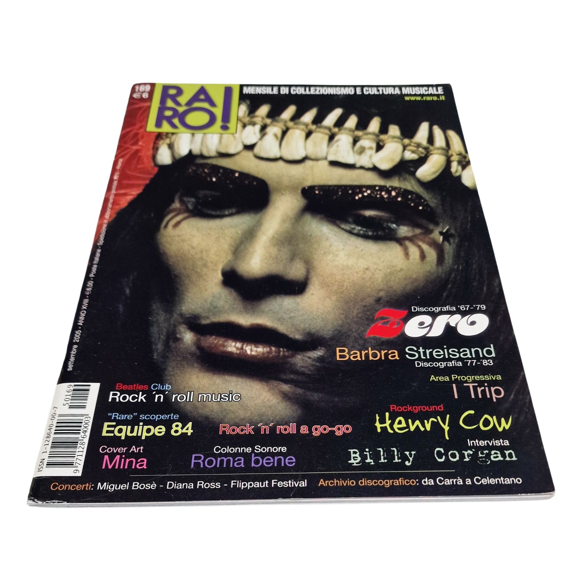 Original issue of RARO! music magazine from September 2005, featuring Renato Zero on the cover and a multi-page article dedicated to his musical journey from the late ’60s to the ’70s.