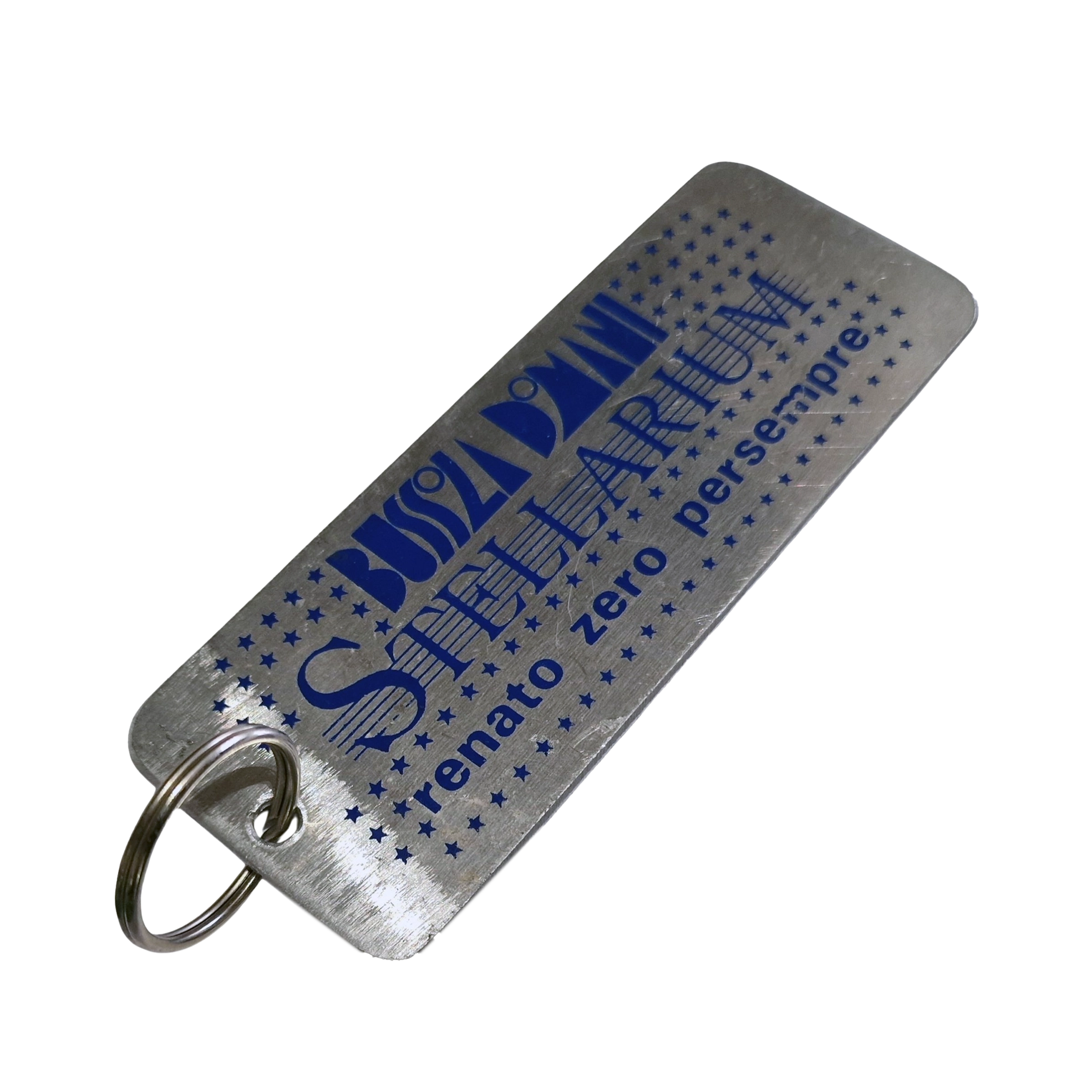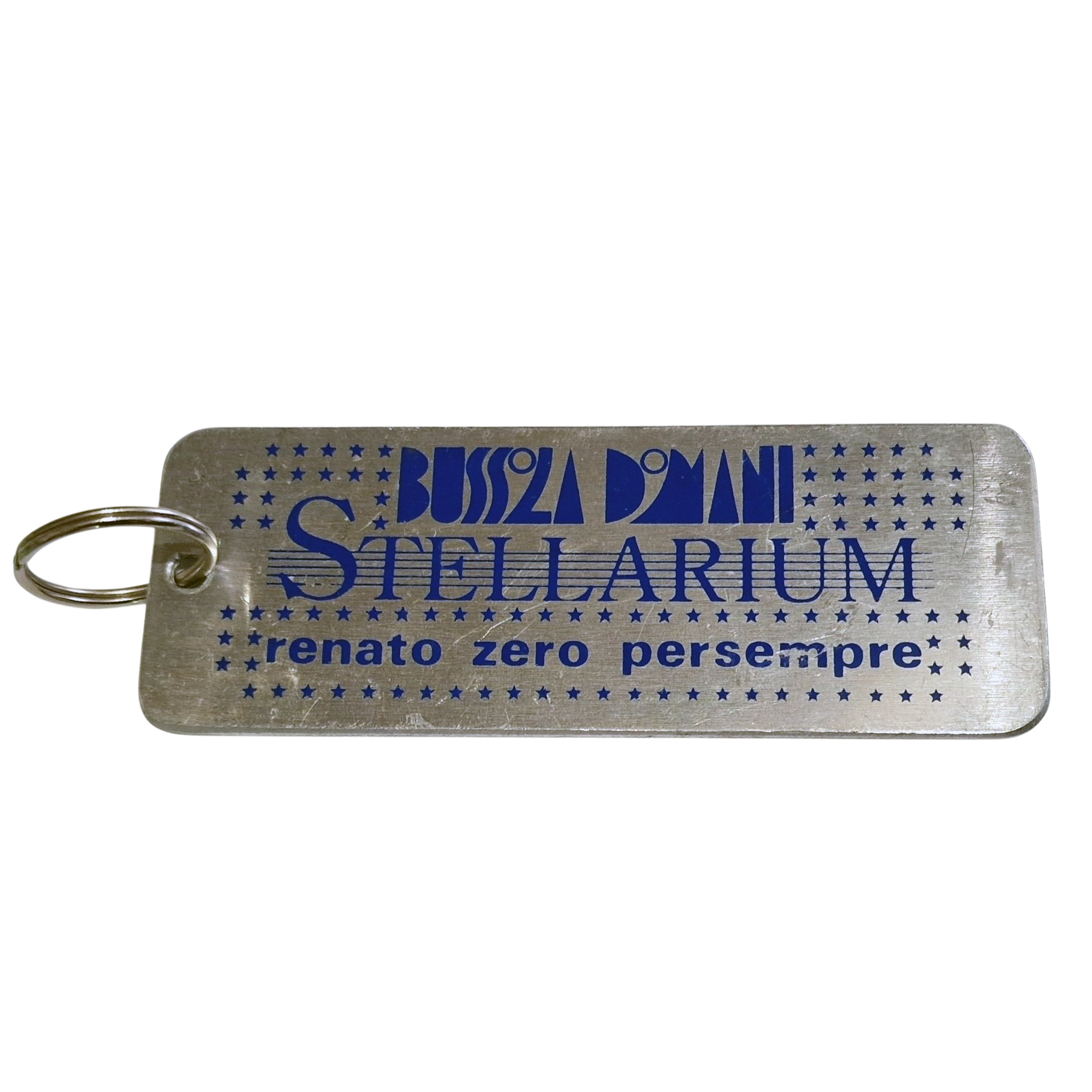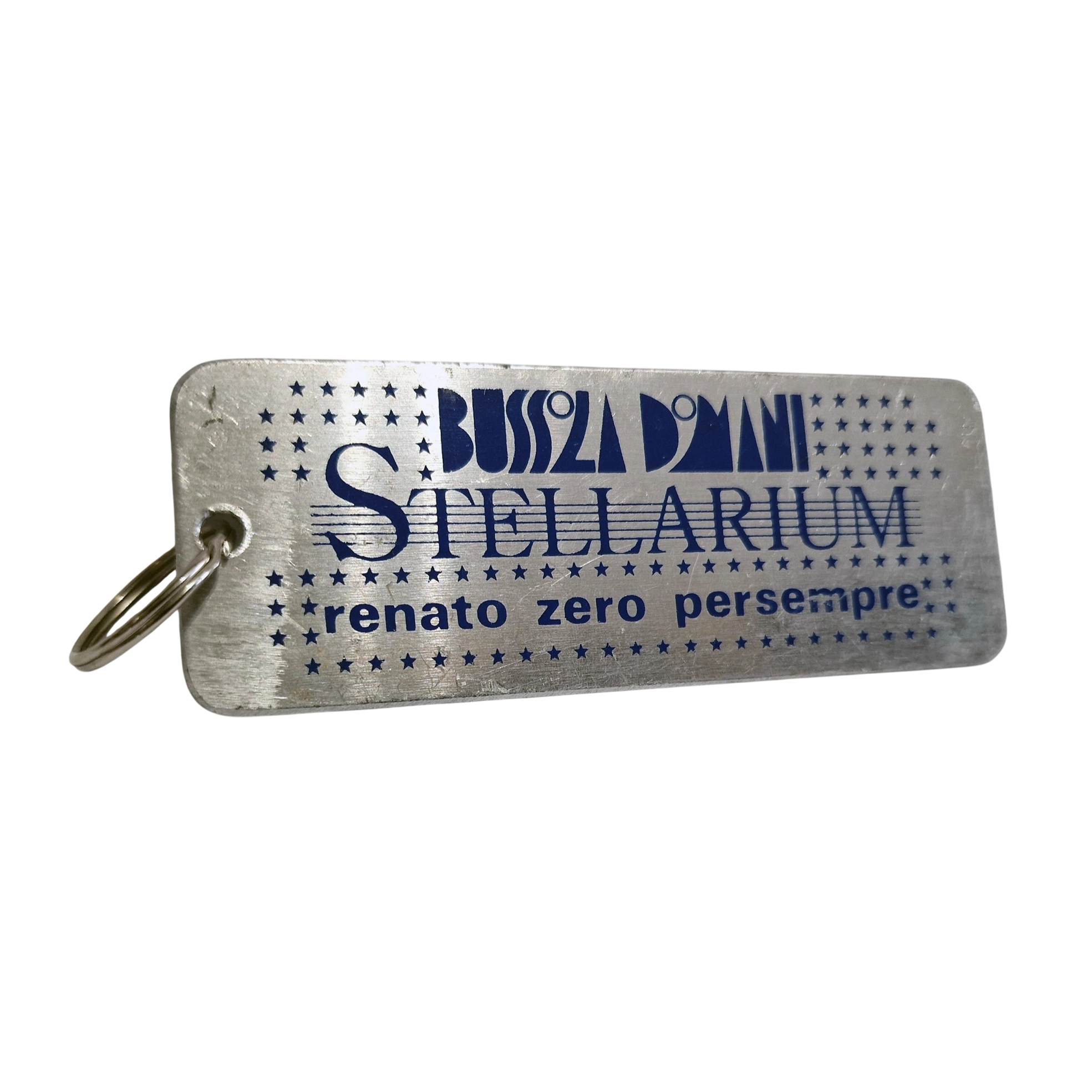 A rare vintage metal keychain created for Renato Zero’s iconic 1990 event “Stellarium – Bussola Domani”, an emotional tribute to his fans and artistic journey.