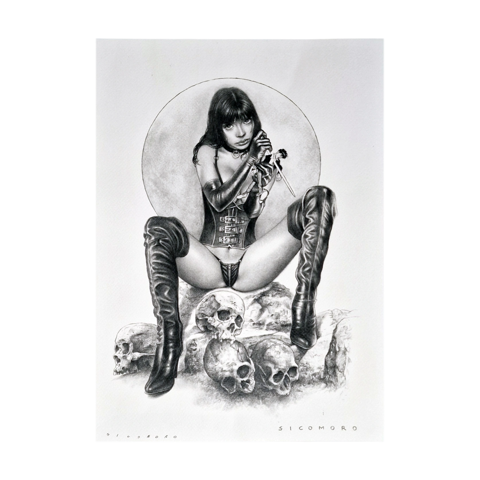 Striking black-and-white artwork hand-signed by acclaimed Italian illustrator SICOMORO during the 12th edition of Pescara Comix & Games (September 13, 2025).