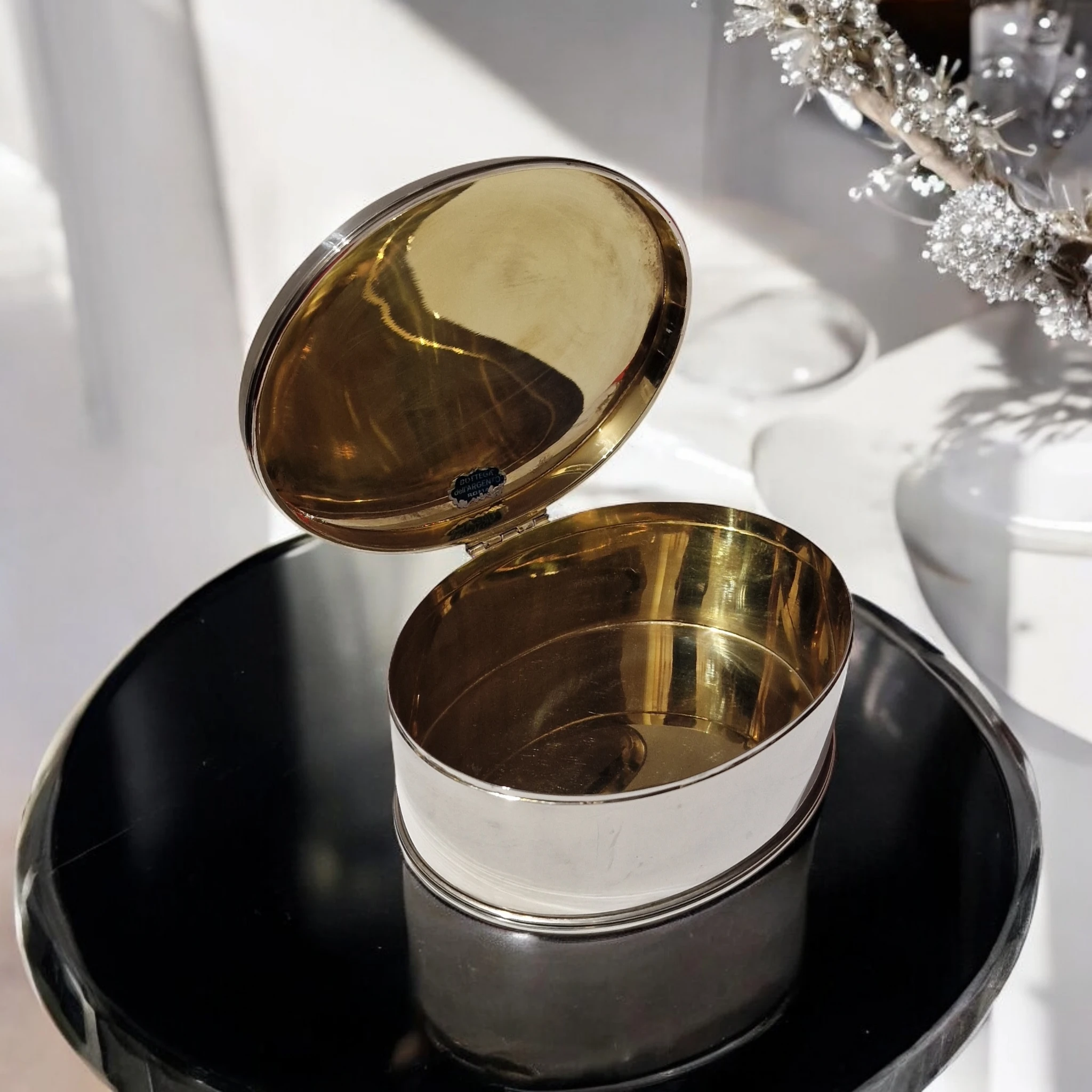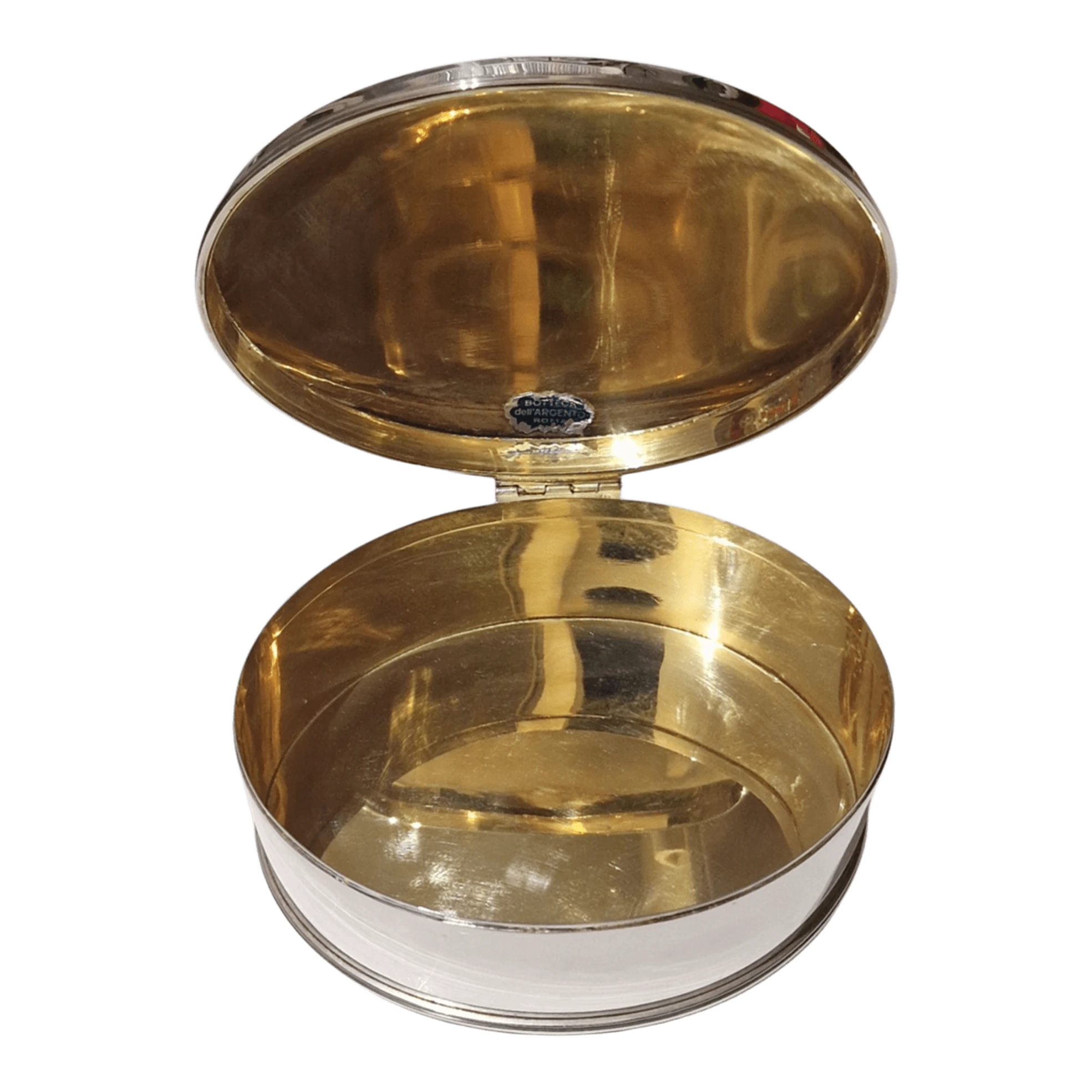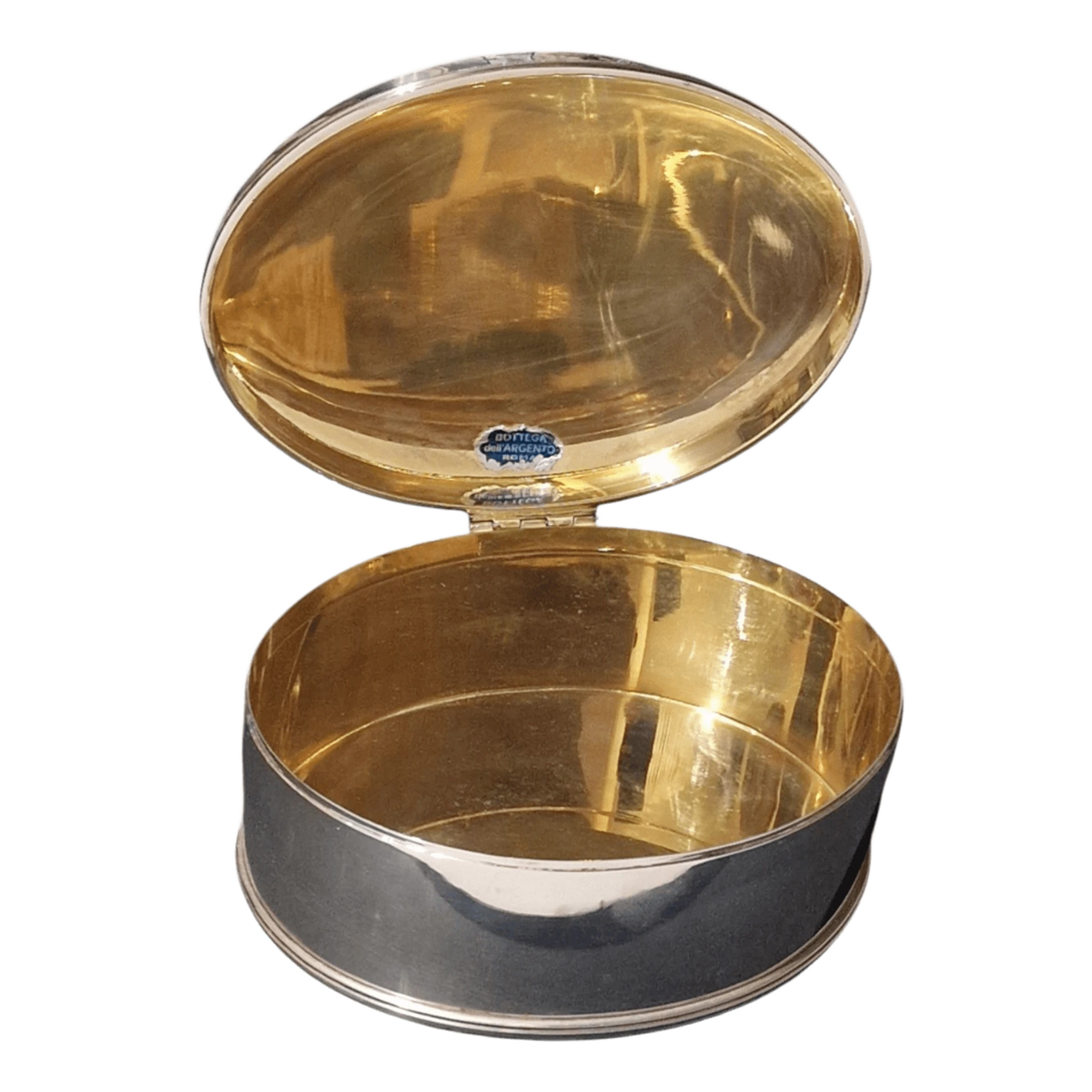 Raffinata scatola portagioie ovale in argento 800 di Stancampiano Argenterie, storica manifattura italiana. L’interno è interamente dorato a caldo, con una bellissima finitura a specchio che valorizza gioielli e piccoli oggetti preziosi.