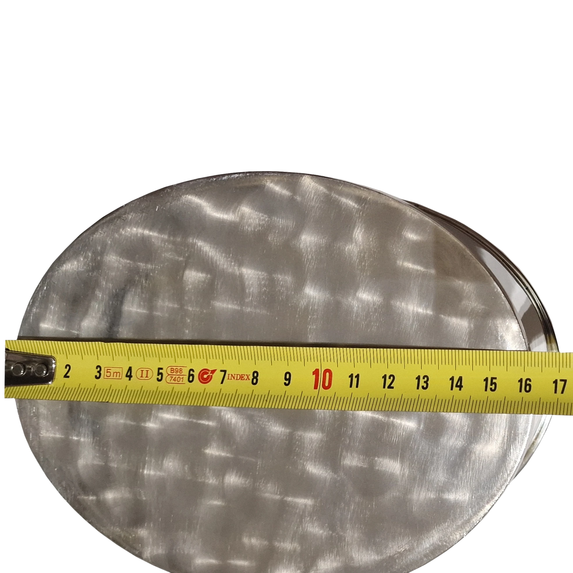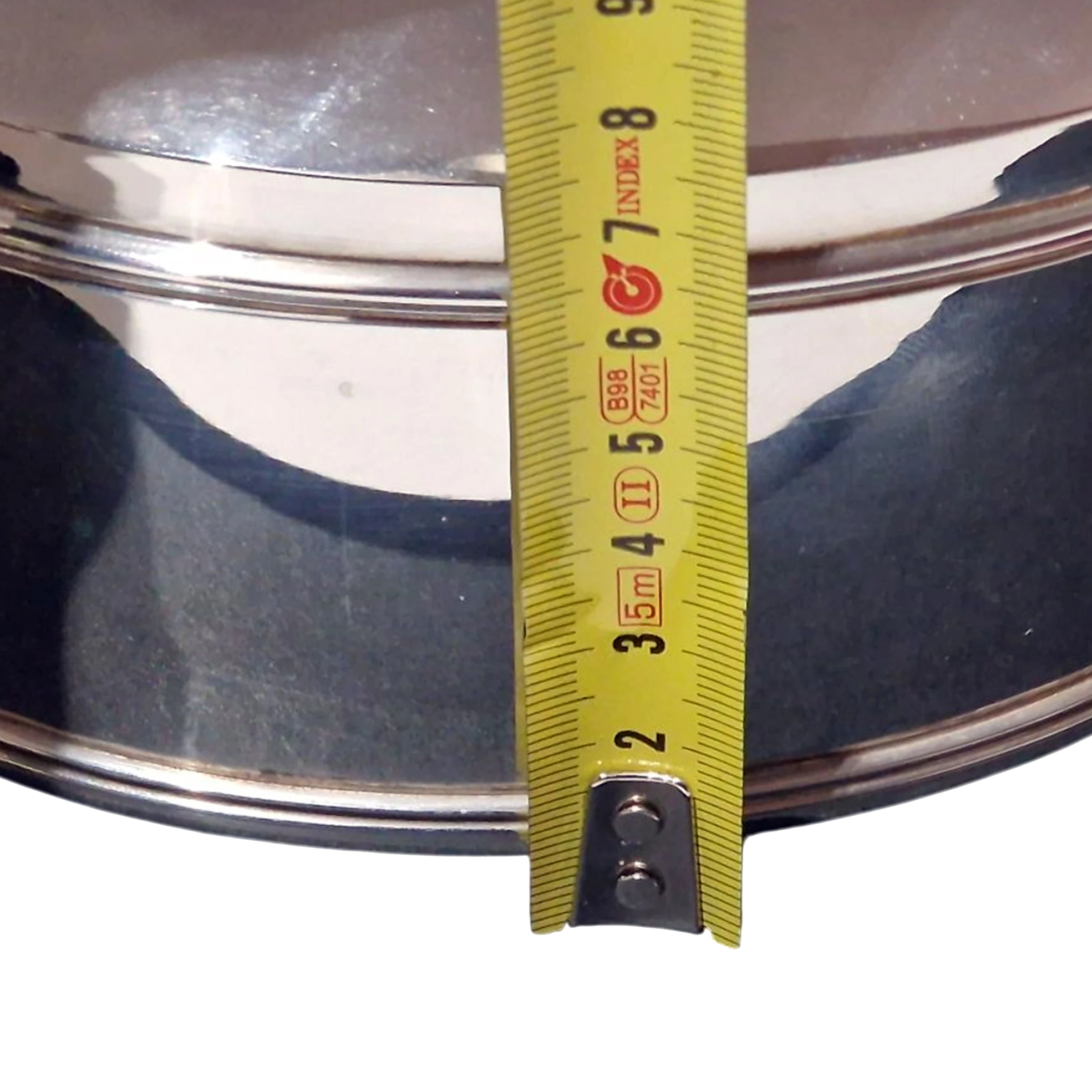 Exterior finish: high polish silver with decorative circular pattern on the base