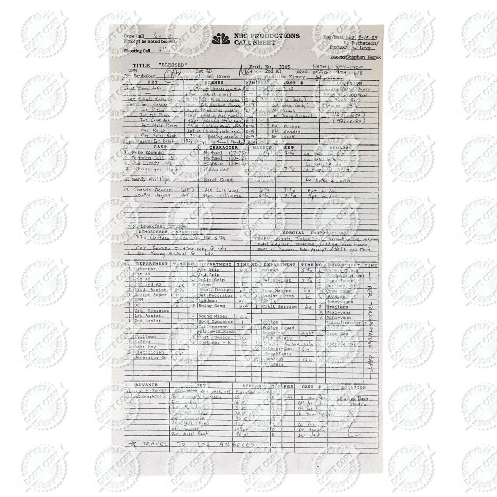 Original production call sheet from the NBC TV movie The Gifted One (working title Blessed), dated June 14, 1989. Authentic double-sided sheet issued to cast and crew for that day of filming.