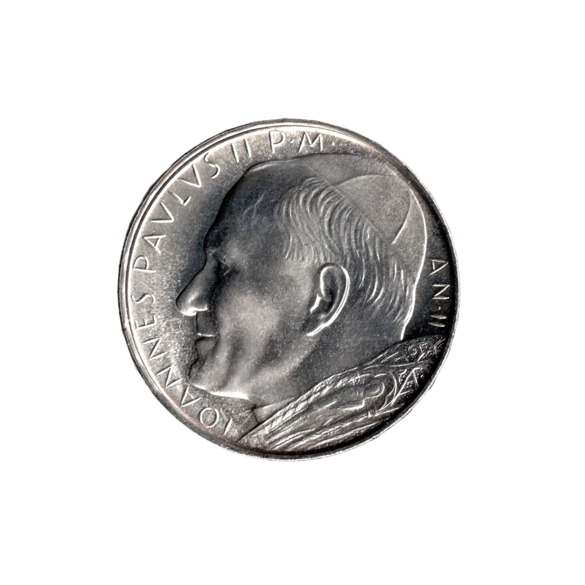 Silver coin issued by the Vatican City State during the pontificate of Pope John Paul II, bearing the inscription ANN II, which denotes the second year of his pontificate. For Pope John Paul II, ANN II corresponds to the calendar year 1980.